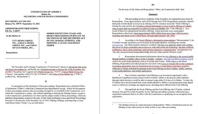 GTV Media Group, Inc., Saraca : Media Group, Inc. and Voice of : Guo Media, Inc. September 13, 2021 agreed to pay more than $539 million to settle the SEC's action. Have you paid it?
