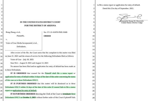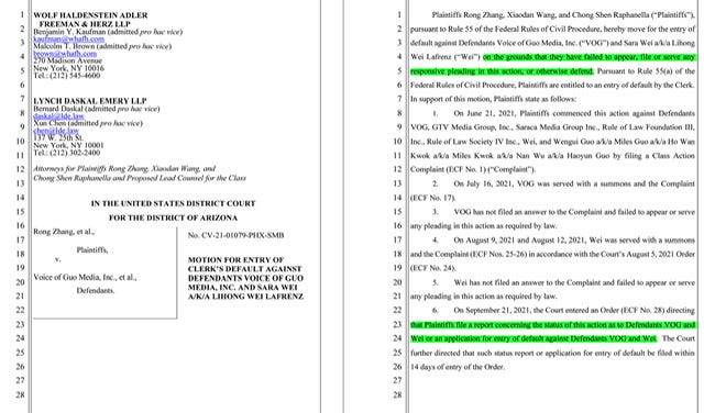 September 30, 2021 the Plaintiffs filed APPLICATION for Entry of Default as to Voice of Guo Media, Inc. and Sara Wei a/k/a Lihong Wei Lafrenz by Chong Shen Raphanella, Xiaodan Wang, Rong Zhang.