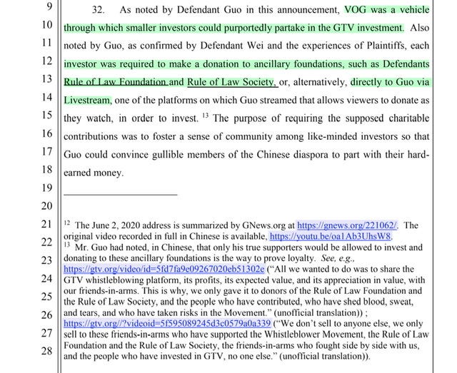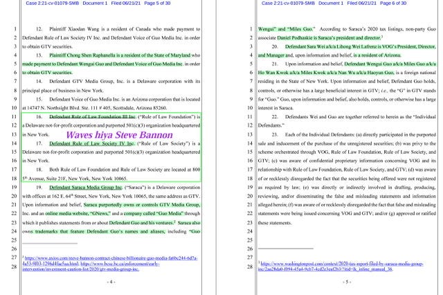 And for the record this isn’t me saying that China Bad -America Good —this is me saying that Guo/Bannon are not as altruistic as they portend to be. It’s all about the money — which subsidizes the numerous nexuses of disinformation, misinformation and actual corrosive propaganda. I’ve uploaded the various court filings discussed in this article - as the S.E.C. filings are open sourced from the S.E.C. Enforcement website (links previously embedded)