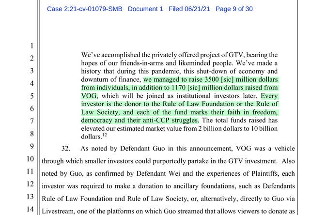 It is also notable that the Defendants pretextual narrative “China is oppressive and censors dissenting opinions” while on its face that is a fairly accurate statement but the distinction here, as alleged in the June 2021 Class Action and further affirmed by the September 2021 S.E.C. Enforcement action. In each filing the parties are unequivocally stating that this scheme is inextricably linked to fraud, or at the minimum —intentional misleading investors by Guo’s own prolific public statements. At a certain point social media companies like YouTube 2, Twitter, Facebook etc also (or at least they should) have some liability here. Notwithstanding CDA-230 offers a full and complete indemnification for the social media platforms.