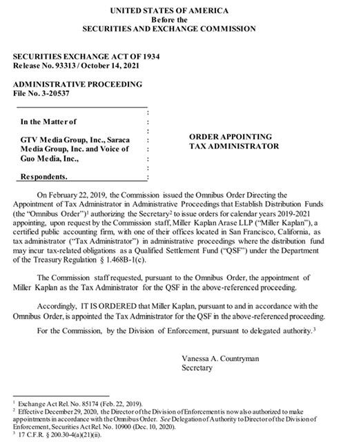 And certainly the GTV Defendants “admit no wrong doing” but agreed to Pay More Than $539 Million in Settlement for Distribution to Investors…on October 14, 2021 an ORDER APPOINTING TAX ADMINISTRATOR was docketed - authorizing the (S.E.C.) Secretary to issue orders for calendar years 2019-2021 appointing, upon request by the Commission staff, Miller Kaplan Arase LLP (“Miller Kaplan”), a certified public accounting firm…