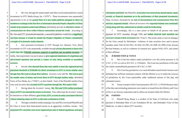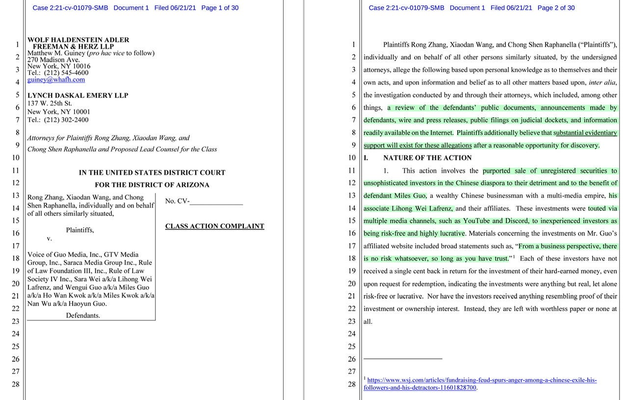 “…purported sale of unregistered securities to unsophisticated investors in the Chinese diaspora to their detriment and to the benefit of defendant Miles Guo, a wealthy Chinese businessman with a multi-media empire, his associate Lihong Wei Lafrenz, and their affiliates. These investments were touted via multiple media channels, such as YouTube and Discord, to inexperienced investors as being risk-free and highly lucrative…
