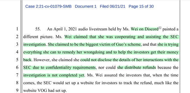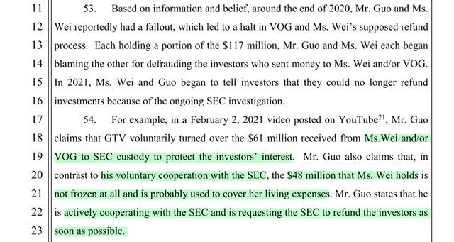 ...Guo claims that GTV voluntarily turned over the $61 million received from Ms.Wei and/or VOG to SEC custody to protect the investors’ interest. Mr. Guo also claims that, in contrast to his voluntary cooperation with the SEC, the $48 million that Ms. Wei holds is not frozen at all and is probably used to cover her living expenses. Mr. Guo states that he is actively cooperating with the SEC and is requesting the SEC to refund the investors as soon as possible.