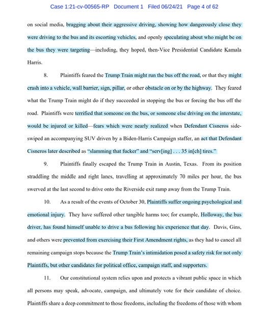Also read paragraph 3 closely - the Plaintiffs directly point to Donald Trump Jr’s video “have some fun” (which was previous embedded at the beginning of this article) -it should be noted that the bus driver has been unable to drive a commercial bus because this incident likely created PTSD for Mr