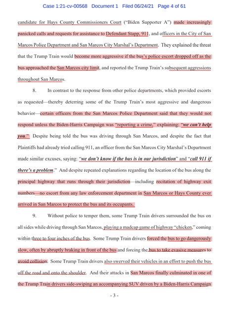 …for at least ninety minutes, the Trump Train pursued and terrorized Plaintiffs. Plaintiffs on the bus tried frantically to find help and safety. They called 911 to report the Trump Train’s activities. Fearing for themselves and others on the road, Plaintiffs requested police escorts. Law enforcement departments up and down the I-35 corridor were aware of the existence and dangers of the Trump Train, and several delivered escorts, some prearranged, to accompany the bus safely along stretches of I-35. These escorts provided a temporary reprieve to Plaintiffs from the Trump Train’s most aggressive tactics.