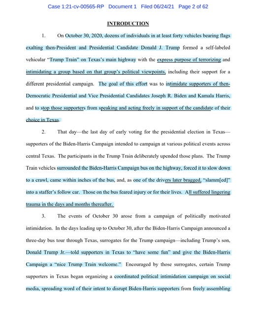 The introduction is pretty self explanatory -meaning the Plaintiffs allege that the Texas Trump Train participants conspired to;