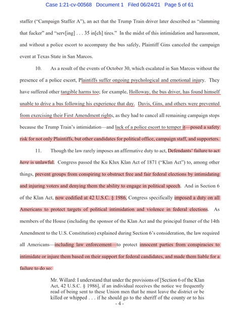 Why § 1986. Action for neglect to prevent -matters in Lawsuit #2 - it is a matter of law versus the City of San Marcos and their police department’s willful failure to help the Biden/Harris bus —which was the target of a high stakes “road rage game of chicken” - specifically read paragraph 11 carefully: