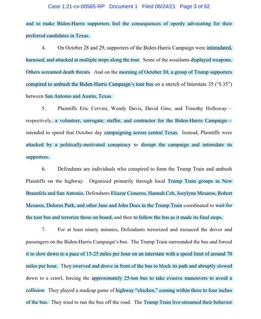 …morning of October 30, a group of Trump supporters conspired to ambush the Biden-Harris Campaign’s tour bus on a stretch of Interstate 35 (“I-35”) between San Antonio and Austin, Texas.