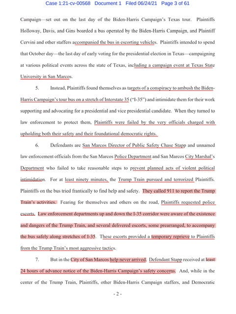 So I sure hope the City of San Marcos, their Police Department and the assailants in the Texas Trump Train are ready because what they subjected the plaintiffs to wasn’t just dangerous - it’s an affront to the First Amendment and I’m not in the habit of encouraging litigation (yes I know that’s ironic) but I certainly hope the Plaintiffs complaints survive the Motion to Dismiss and swiftly enters the discovery phase.